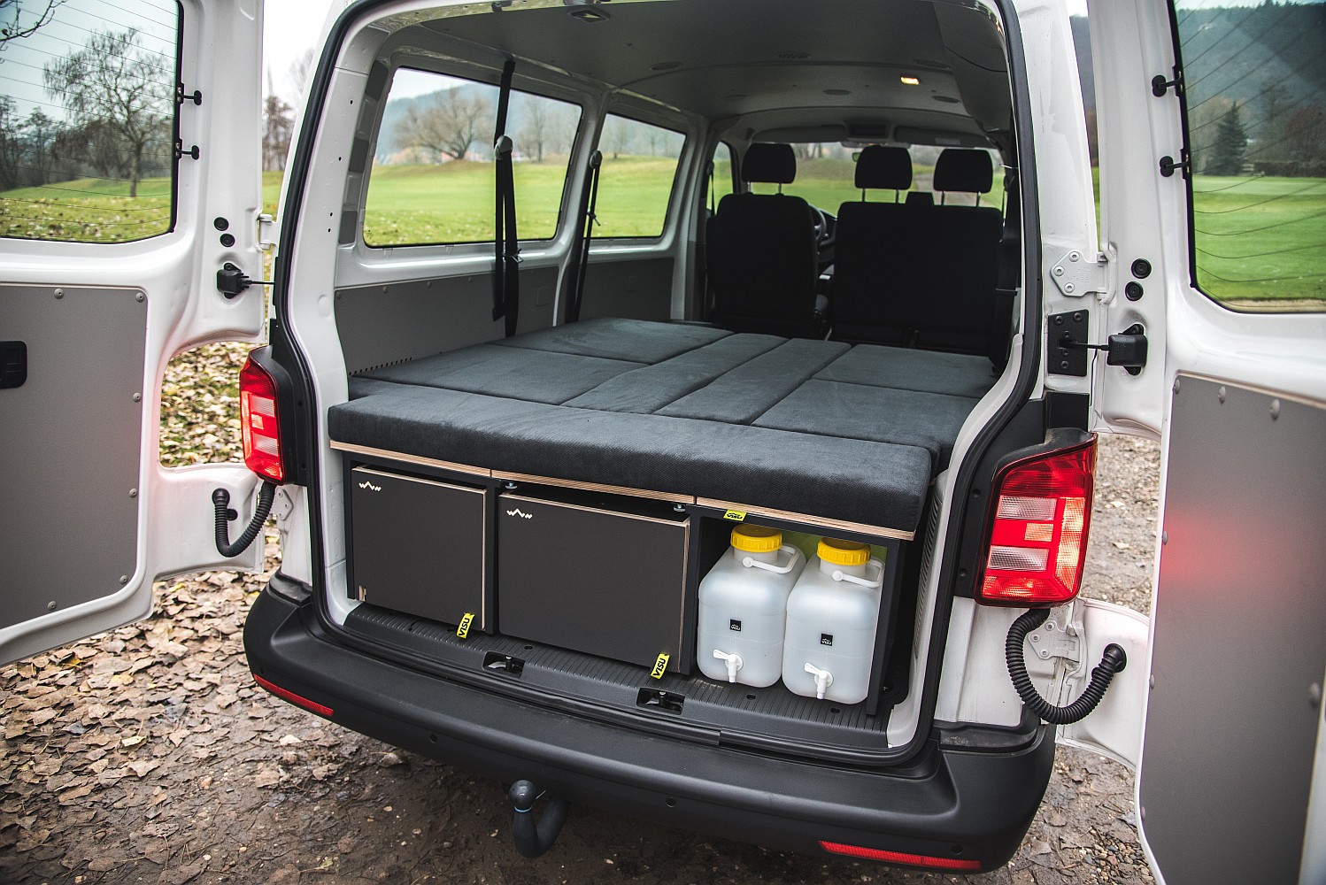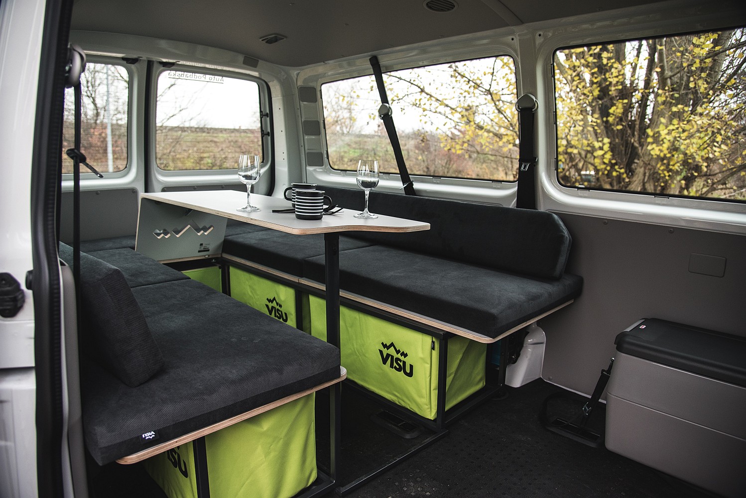 Postel v plné šíři vozu, sezení se stolem, úložné prostory (4x Visu Tashka) - celkem cca 300 litrů, kuchyň, vařicí box, připevnitelný plynový vařič s piezo zapalováním, plynová cartridge 450 g, kempingové nádobí na vaření, úložný box, 2 vyjímatelné plastové boxy, 2 kempingové skládací sklenice na víno, plechové hrnky, bambusové prkénko, 2 sady příborů, kanystry – 2x 10 litrů, kanystry s výpustí na přední straně, kompresorová lednice Indel-B o objemu 30 litrů, horkovzdušné nezávislé topení.